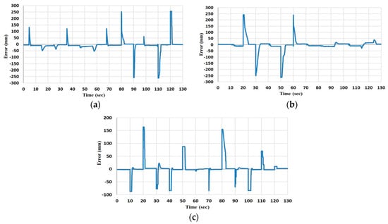 The error of x, y, z displacements, respectively (a) The x position error. (b) The y position error and (c) is the z position error.