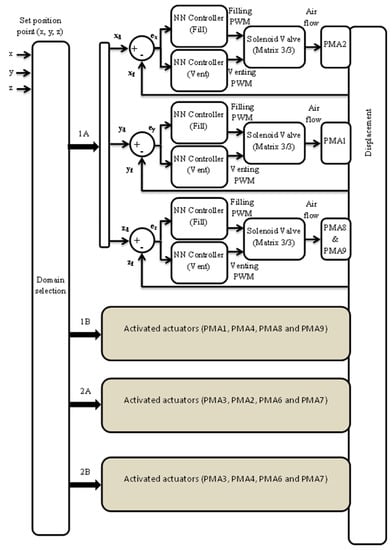 The algorithm distributes the axes to the actuators and provides an easy and effective strategy to control the position of the soft robot arm at any load condition. The controller system in Figure 20 has been applied to an example of movement from the initial point (0, 0, −720) to the target point (−30, −120, −650) at three load conditions (no-load, 300 g and 500 g) and for three repetitions at acceptable accuracy as in Figure 21. Moreover, this motion used four actuators (PMA1, PMA2, PMA8 and PMA9), while other motions could use other combinations of actuators but under the algorithm above.