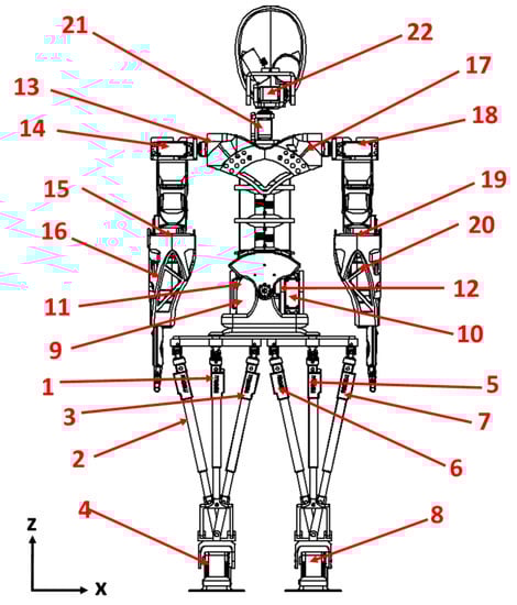 In Table 1, the main features of the LARMbot 2 are summarized. The entire humanoid is driven by 22 motors. Sixteen motors are rotational motors, while six are linear actuators. The position of the motors is shown in Figure 2, with additional details on the type and location of motors shown in Table 2.