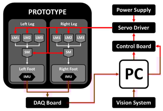The control system of the novel locomotion module was based on Arduino boards [20], with a single Arduino Nano board with a PID control for both legs, passing through an Adafruit PWM Servo Driver board [21] to control the servomotors [22,23] with a velocity-based PID controller. An Inertial Measuring Unit (IMU) [24] was placed on the moving platform of the parallel mechanism for each leg to measure the angular displacement and linear acceleration of the prototype. A current sensor was used to measure the power consumption, since the power supply was set to a constant 6.8 V voltage. Another Arduino Nano board controls all the sensors. A computer was used both as remote the control for the locomotor and to acquire and store the data from the sensors. The control system is summarized by the conceptual scheme in Figure 8, and motion control was based on the closed-form expression of kinematics as presented in Reference [16].