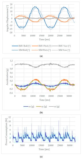 Results of a walking test: (a) angular displacement of the foot; (b) Accelerations measured by the IMU on the foot; (c) Acquired power consumption.
