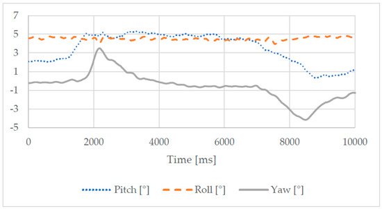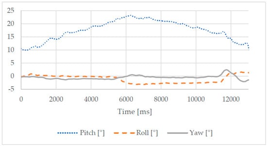 The second test mode was characterized by the same lifting movement along the vertical axis. There was a payload of 1.00 kg applied to the back of the torso. The results for this test mode are shown in Figure 13 and Figure 14. The plots in Figure 13 show that the torso tilts forward during the lifting phase (pitch angle varying of approximately 15°), while the variation of the other angles is less significant. The angular motion was extremely limited, with a maximum variation of 5°. The motion was performed in a smooth, continuous motion, as shown by the small variation in the linear acceleration in Figure 14. The peak of power consumption in this test was approximately 25.00 W.