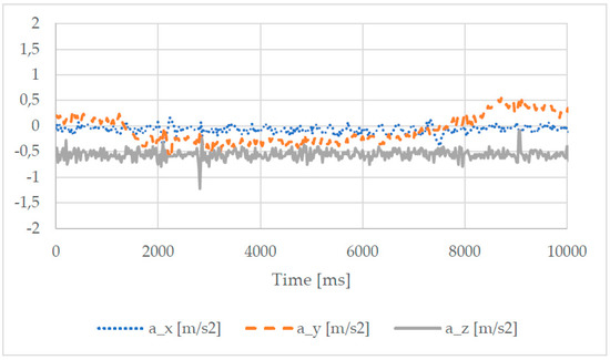 The acceleration was normalized to the standard acceleration due to gravity g (9.80665 m∙s−2), where the effect could be observed even on the value of the linear acceleration along the Z-axis, that was oscillating around 1g instead of 0. The graph in Figure 10b shows that there were no sudden changes in the motion and that the entire walking operation was fairly smooth, with a maximum acceleration of 0.2 g, thanks to the stiff operation of the parallel architecture of the leg design.