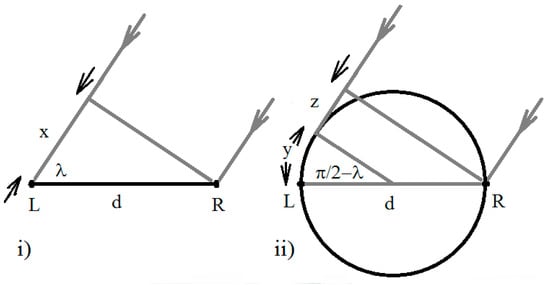 Simple geometries for binaural auditory systems with antennae: (i) disposed at the ends of a line; and (ii) disposed on opposite sides of a spherical head. These are shown in top view for antennae receiving incoming horizontal acoustic rays from a source at far-range.