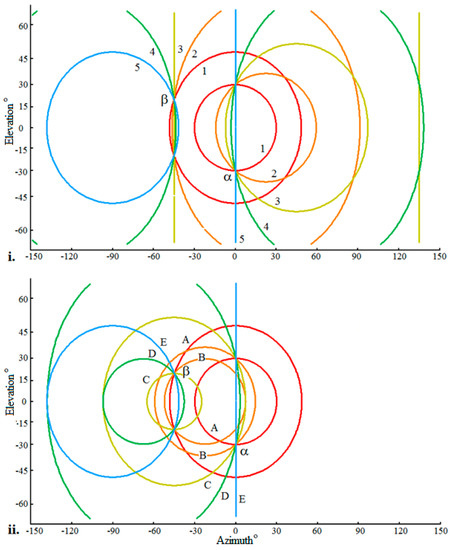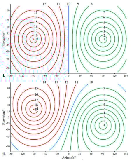 The lambda circles shown in Figure 3 are the loci along which CCF coefficients associated with the data in Table 1 would be distended to form an acoustic image of the field of audition corresponding to the short-time base CCF illustrated schematically in Figure 2. Data at peaks in the CCF would be distended over corresponding lambda circles. Circles are shown in Figure 3 for two orientations of the auditory axis on the head. Figure 3i shows circles for the case of a horizontal auditory axis. Figure 3ii is for the case of the auditory axis sloping to the right across the head at an angle of = 20° in emulation of a feature of the auditory systems of species of owl [34,35,36,37]. The lambda circles for a horizontal auditory axis are symmetric about the horizontal (zero elevation) whereas the lambda circles for an inclined axis are symmetric about an inclined great circle passing through the point azimuth = 0°, elevation = 0°.
