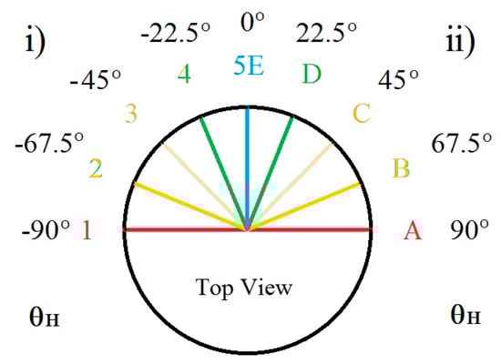 Bearings of the direction the head is facing with respect to the direction it faces after turning: (i). from facing 90° to the left ( = −90°) (1 to 5) and (ii). from facing 90° to the right ( = 90°) (A to E) in 22.5° intervals (red to blue). These are the values assumes in Table 2 and Figure 5; and in Table 3 and Figure 6.