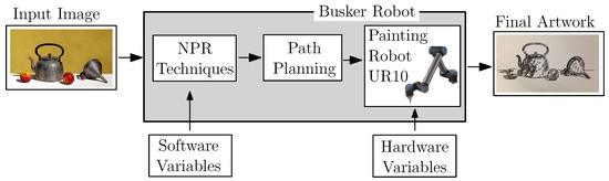 Busker Robot is a system with amodular architecture, consisting of both hardware and software parameters (Figure 2). The hardware is composed of the painting machine, a 6-DOF robotic arm by Universal Robots, mounted in front of the painting support and equipped with a changeable brush. The software consists of the image processing and the path planning algorithms, that have been implemented in MATLAB®. The image processing algorithms, i.e., the non-photorealistic rendering techniques, are applied to a digital input image that is processed in order to extract the contours, the details and the backgrounds that have to be reproduced on paper. Several different algorithms have been developed for Busker Robot [1,2]: it is the artists responsibility to choose which technique, or combination of techniques, has to be applied case by case.
