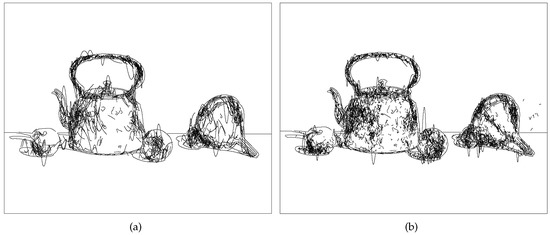 The size of the box allows to control the total length of the splines, whereas the survival rate constant allows to concentrate the strokes in the darkest part of the original grey-scale image. Since the points are placed inside a thresholded layer but the box is independent from the layer contours, the resulting splines can be drawn even in parts of the image that do not belong to that layer. This results in lines that exceed the natural border of an object in the image. The resulting splines can be finally filtered to remove those with the shortest path. The software parameters that can be manually defined are listed in Table 3. Two examples of Random Splines for the Still Life with Tea Kettle are shown in Figure 7, obtained with the parameters reported in Table 4.