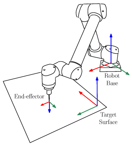 The target surface for the painting task is identified with respect to the base coordinate system of the robot (Figure 8). Since a parallelism error between the base of the robot and the target surface could affect the application of color on the paper, a calibration of the painting board is carried out before starting a new artwork. Furthermore, if the target surface is not perfectly planar, a planarity error arises and an approximate interpolating plane has to be defined by more than 3 points. This calibration is performed by measuring a set of n points , with , on the drawing surface, with respect to the robot reference frame . After equipping the end-effector of the robot with a rigid and sharp tool with the same length of the brush, the tip of this is positioned so as to touch the surface and the corresponding pose of the robot is recorded. In order to calculate the approximating surface , the following over-determined linear system has to be solved: