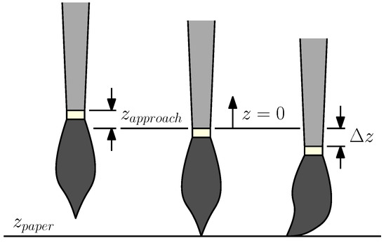 A characterization of the brush strokes has been performed in order to estimate the influence of the z-coordinate of the brush (Figure 9), the traveled path and the robot speed on the stroke parameters: the black intensity and the thickness. This enables us to control the thickness of the strokes, to determine the traveled length after which the brush has to be dipped in the ink and to ensure a smooth deposition of the paint along the strokes.