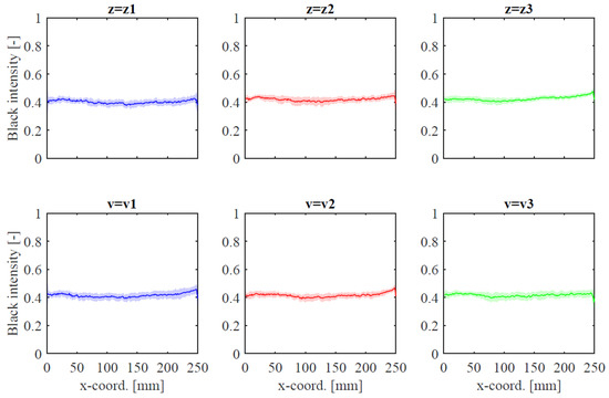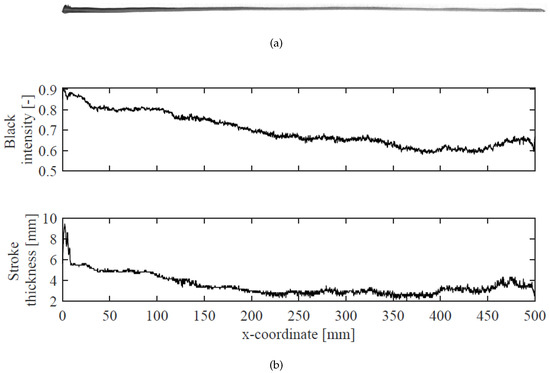 From Figure 12, it can be seen that the black intensity is almost constant along the strokes and it is not affected by the z-coordinate or by the robot speed. The black intensity shows a limited increase in the last part of the stroke. This could be due to the trapezoidal motion profile, which is characterized by a deceleration phase that can affect the paint deposition process. In this manner, a slower speed can cause an increase in the paint deposition per linear distance. On the other hand, a high painting speed can cause undesirable effects in the starting and end points of the stroke, due to a rough landing and detachment of the brush on the target surface, as well as the dry brush effect [1].