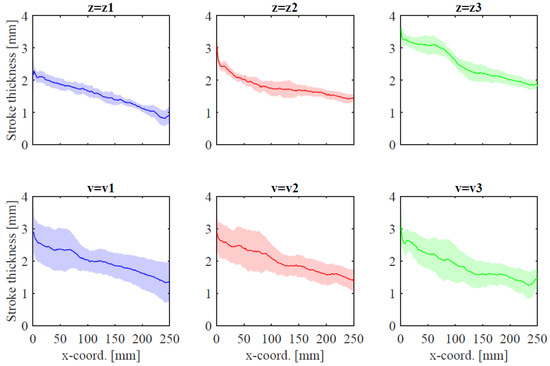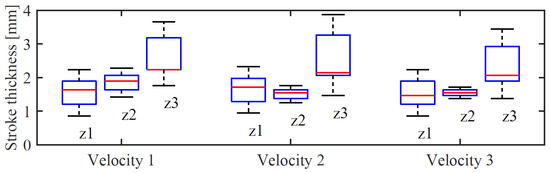 Conversely, the stroke thickness shows a decreasing trend along the stroke (Figure 13). The z-coordinate of the brush affects the stroke thickness, since the more the bristles are pressed against the paper, the larger the strokes are painted. The robot speed seems not to be relevant in the tested range of values. The values of the mean thickness along the whole strokes have been computed as well and the results are reported as box-plots, in Figure 14.
