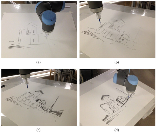 In more recent years, several artists, engineers and computer scientists developed robots and machines skilled at drawing and painting. One example is given by the humanoid drawing human portraits by S. Calinon et al. [9], whereas G. Jean-Pierre and Z. Said developed the Artist Robot, a 6-DOF industrial robot programmed for drawing portraits using visual feedback [10]. Other examples are given by the works of C. Aguilar et al., who developed a system composed of an articulated painting arm and a machine-learning algorithm aimed at determining a series of brush strokes to be painted on the canvas [11]. An interesting example of robotic installation capable of drawing sketches of people is given by the machine developed by P. Tresset and F. F. Leymarie [12,13]. The system, based on visual feedback to iteratively augment and improve the sketch, draws using the equivalent of an artist’s stylistic signature. Furthermore, T. Lindemeier et al. presented e-David, a modified industrial robot that works with visual feedback and it is based on non-photorealistic rendering techniques [14,15]. The painting machine applies different layers of strokes on the canvas and produces beautiful artworks that mimic those produced by humans. Recently, the brush technique has been further improved by J. M. Gülzow et al. [16], who developed a method to analyze human brushstrokes and replicate them by means of the robotic painting system with impressive results.