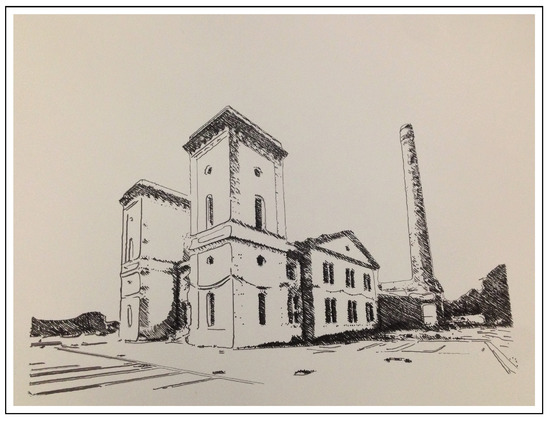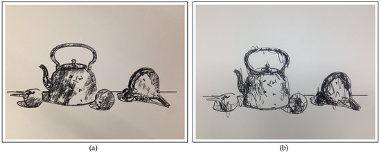 Experimental results of the robotic painting system are reported in Figure 16 and Figure 17, where the resulting artworks “Hydrodynamic Power Station” and “Still Life with Tea Kettle” are shown. The second subject has been realized with both the cross-hatching and the Random Splines techniques, to have a visual comparison between the results of the two NPR algorithms (Figure 17a,b).