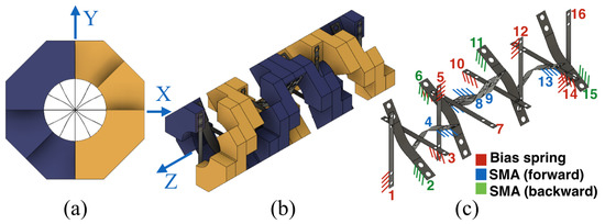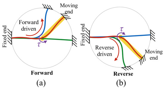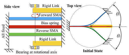 Figure 11. According to the DHCJ motion that can rotate in a circular path, the rigid link that acts as the radius arm is attached at the upper and lower parts. Two bearings are used to constrain the motion only around the principal axis. There are two SMA leaves for forward and reverse driving. A pre-bent angle was added to both leaves to avoid the beam buckling shape problem. When the SMA is energized at the forward side, the reverse SMA is bent to a straight shaped. Similarly, when the reverse SMA is energized, the forward SMA will become straight either as shown in