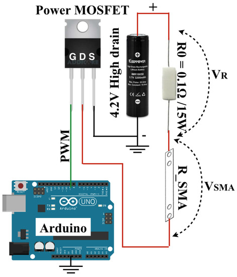 A pulse-width modulation (PWM) drive was used because it is an efficient way to control the SMA and it exhibits a linear proportional relationship between the power and duty cycle. To provide the proper amount of electrical energy, a high drain lithium ion battery (IMR 18650) was used. To generate heat in a short time, the SMA strip was shorted-circuited. For this experiment, the circuit shown in