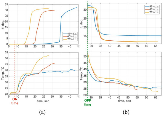Figure 15a shows that the higher voltage can decrease the SMA response time, but it also caused higher temperature. When the energy was released during the “off” time, all of the SMA’s temperature dropped down similarly from the maximum temperature to approximately 30