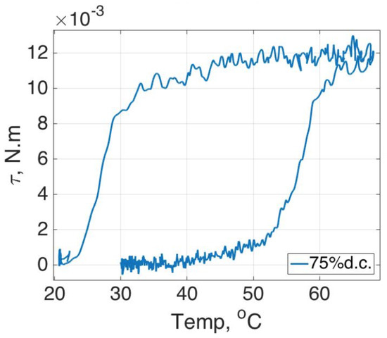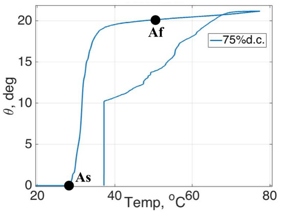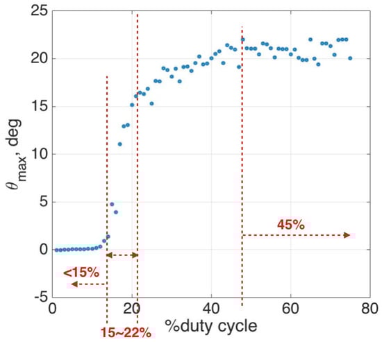 Figure 15b. The testing results show that the SMA strip works from 45% to 75% duty cycle with 4 V amplitude and 10 A drawing currents; for lower duty cycles, the SMA only slightly changed and never reached the maximum angle of 30