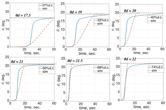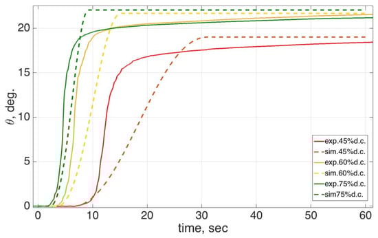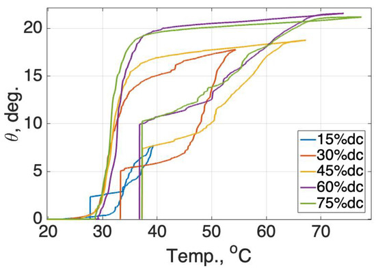 Figure 15. A 45% duty cycle yielded a lower temperature, but it required more time to reach the maximum angle.