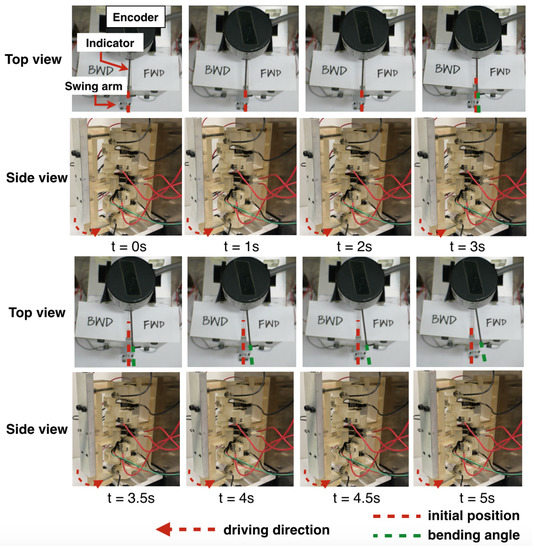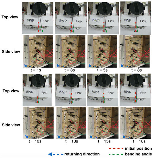 Figure 14 were tested with the same configuration, and the result shows that from no pre-bent angle to a small pre-bent angle, the SMA seemed to give much power to drive, but in fact the opposite SMA resisted the motion, resulting in only a small angle movement. A large pre-bent angle, such as 45 degrees, yielded the expected result in which the overall motion turned by only a small angle because the initial point was already half of the memorized shape, so the power was not enough to induce a large deflection angle. The pre-bent angle of 30 degrees was chosen because it can have the largest deflection angle at 30 degrees for each side.