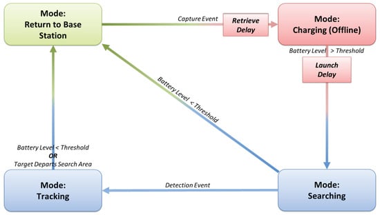 The search and track task modes are inextricably linked. Search mode consists of a trajectory prescribed to each agent and is the default mode when a vehicle is launched. Track mode is triggered by a detection event prompting a UAV to follow the identified target. Return mode is triggered when an agent’s battery drops below a designated threshold. In return mode, the agent guides itself to the base station to recharge. Recharge mode accounts for the recharging period, wherein the agent is offline and no navigational or sensing computation is needed. This mode is triggered by a docking event with the recharging station following a delay associated with the time required to capture an agent. When a charging vehicle’s battery level exceeds a specified threshold, it is marked as available, and the cycle can repeat. Note that available agents can continue to charge until they are needed. The launch and retrieve delays are motivated by the autonomous recharging system presented in [6,13]. Our work assumes that vehicles default to search mode immediately following launch. This is a possible limitation that is the topic of ongoing research.