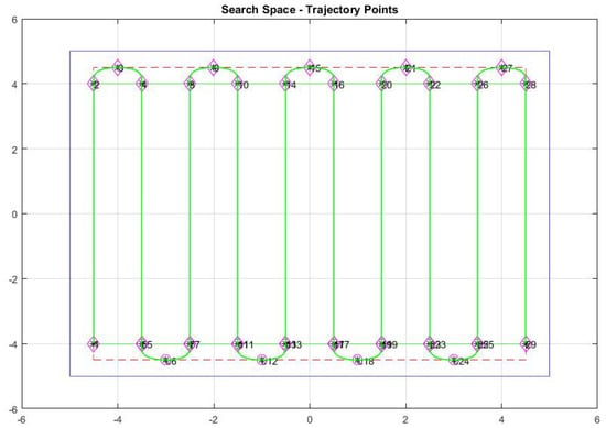 Figure 2 shows an example of the resultant pattern in a rectangular search space using Equations (9)–(13), where the green line is the desired path and the red and blue lines illustrate the search boundary offsets.