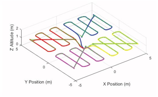 Figure 3 illustrates a simple partition showing four equal quadrants. The results of Section 2.1.2 and Section 2.1.3 subsequently enable trajectory generation within each quadrant. The dashed lines in each quadrant indicate the desired trajectory, whereas the solid lines show the simulated trajectories of the quadrotors using the trajectory tracking controller [14].