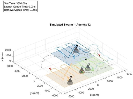 Here, we present the results of simulations with varying quantities of agents and targets. We varied the number of agents between 4 and 12 and varied the number of targets between 1 and 3. Each simulation assumed a 1 h search and track mission. Figure 4 is a visualization of an example simulation operating with 12 total agents searching for 3 random targets. The black numbers indicate search agents, with light gray denoting sensor cones. The red numbers are untracked targets and the black letters are tracked targets; positions of all simulation elements for the previous minute are illustrated by dashed (targets) and solid (agents) lines. The color patches are search cells occupied by agents assigned to the search mode. Note that at this particular time in the simulation, agents 1, 2, 3, and 7 are deployed, whereas the remaining are either charging or in queue for deployment. The figure illustrates the complexity of the multi-vehicle mission.