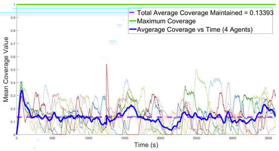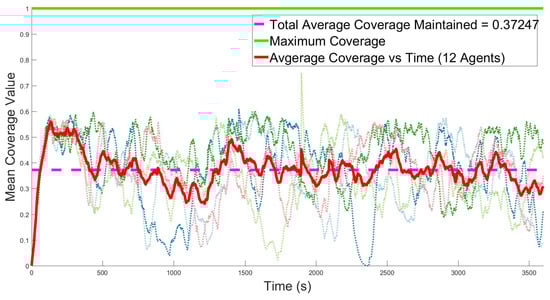 Figure 5 and Figure 6 show the average coverage value for the search region over time. The light colored dotted lines are the values for individual simulations, the green line is the maximum value, the solid line is the average for all trials over time, and the dashed magenta line is the overall average of all runs and all time. Recall from Section 3.1 that the ideal case is the maintenance of 100% coverage for all time, which equates to 0 seconds since the last revisit. In Figure 5, the average coverage value, approximately 0.13, corresponds to 43 s since the last revisit averaged across the entire search space. In the 12-agent case, the average value hovers near 0.37, as shown in Figure 6, corresponding to 32 s since the last revisit. As shown in the figures, the general coverage value tends to increase as the number of available agents increases.