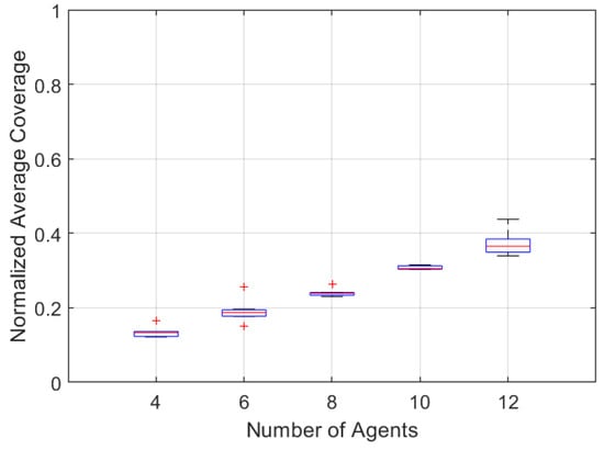 Figure 7 illustrates coverage trends for the three target experiments and an increasing number of agents. The box plot shows an increase in average coverage as the number of agents increases. As expected, Figure 7 shows increasing coverage as the number of agents increases.