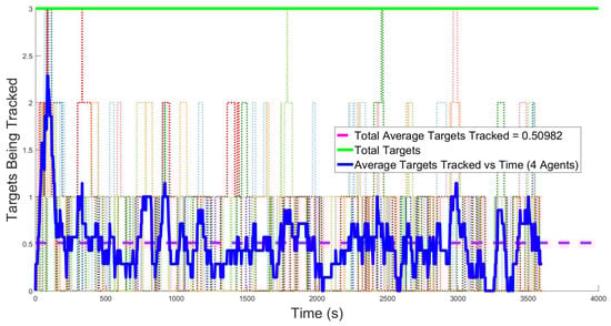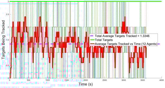 Figure 8 and Figure 9 describe the overall tracking performance of the group over time. Light colored dotted lines illustrate individual experiments, the green line shows the maximum number of targets (three, in the figures shown), the solid line is the average for all trials over time, and the dashed magenta line is the overall average of all runs. However, as shown in the figures, having more agents available results in more targets being tracked, an expected outcome. Figure 8 shows 4 agents are able to track 0.5 out of 3 targets on average. Figure 9 shows that, on average, 12 agents are able to track nearly 1.5 targets for all time.
