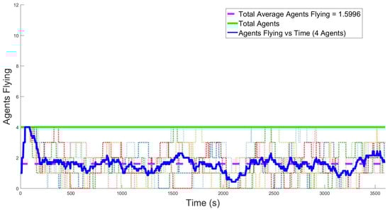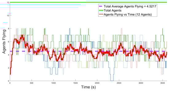 Figure 10 and Figure 11 show the overall vehicle usage as a function of time. The light colored dotted lines are the values for individual experiments, the green line shows the maximum number of agents available, the solid line is the average for all trials at that time, and the dashed magenta line is the overall average of all runs. This metric is intended to measure the effect that recharging has on the operation of the group. The ideal case is to have the maximum number of agents flying. However, given the search area and number of targets, there may be fewer than the ideal number of agents needed. As shown in the figures, more available agents imply more agents are airborne on average, an expected outcome of adding more agents to the simulation. In Figure 10, of 4 available agents, approximately 1.5, on average, are airborne throughout the whole experiment. Figure 11 shows that when increasing the total number of agents to 12, an average of nearly 4.5 agents are airborne over all simulations. In both of these cases the average number of agents airborne is 37.5% of the total number of agents.