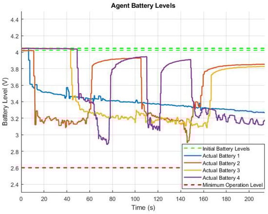 The battery status for each of the agents directly relates to the usage metric because recharging is the highest priority operational mode. Any agent will drop its task to go recharge if needed, regardless of the task it is accomplishing. Each agent completes approximately three battery life cycles over the course of a 60 min experiment. Overall, the increase in average usage as the number of available agents increases is a numerical validation of the expected behavior of the group and motivates investment in having the ideal number of agents.