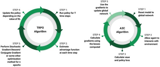 Figure 4. Training architectures of Asynchronous Advantage Actor Critic (A3C) and Trust Region Policy Optimization (TRPO) agents.This approach does not require learning stabilization techniques like memory replay as the parameters are updated simultaneously rather than sequentially, hence eliminating the correlation factor between them. Furthermore, there are action-learners involved in this method that tend to explore a wider view of the environment and helping to learn an optimal policy. A3C has proven to be the stepping stone for DRL research and to be efficient in providing state-of-art results alongside reduced time and space complexity and its range of problem-solving capabilities. - Advantage Actor-Critic (A2C) [52,53]: It is not necessary that asynchronous methods lead to better performance. It has been shown in various papers, that synchronous version of the A3C algorithm provides fine results wherein each actor-learner finishes collecting observation after which they are averaged and an update is made.