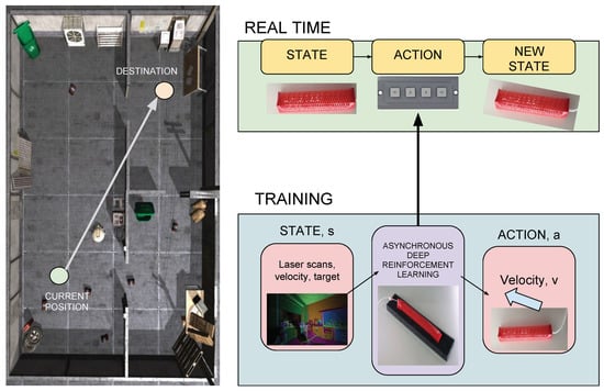 Expected application of DRL techniques in the task of navigation. Inset adapted with permission from [71]. Copyright 2018, American Association for the Advancement of Science.