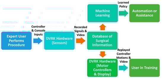This system has many potential important applications, including (1) training of surgeons and (2) generation of training data for machine learning algorithms to automate certain tasks (see Figure 3). Data from an expert surgeon interacting with the console and hand controllers can be recorded in a time-synchronized database of information. This data could be used to either learn policies from human demonstration or be replayed for use in training.