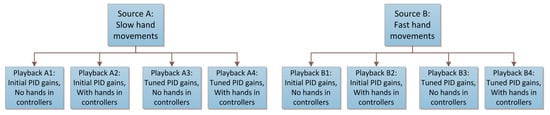 Figure 7. A diagram of the 10 recordings that were made to evaluate the system. A human operator moved the hand controllers for the top two source boxes, whereas the proportional–integral–derivative (PID) control system played back the corresponding source recordings for the bottom boxes.