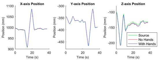 Figure 9. Comparison between the source data (during recording) and the replayed data (both without and with hands in the hand controllers) in terms of the x-, y-, and z-axis positions of the endpoint of the left hand controller. This position data was computed using joint feedback and a kinematic model of the hand controller.
