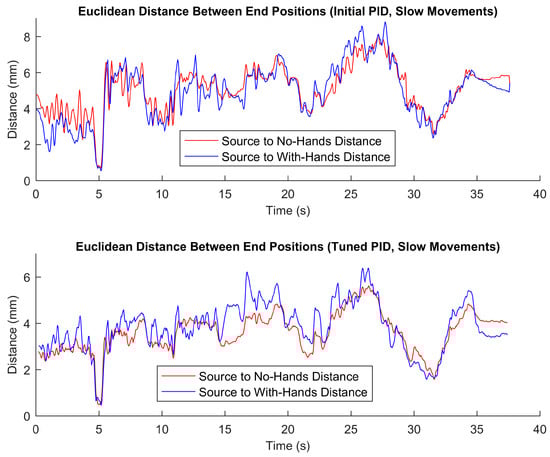 Figure 10. Distances between the source data (during recording) and the replayed data (both without and with hands in the hand controllers) in terms of the end position of the left hand controller during slow movements. The top graph is based on playback using the initial PID parameters (without our tuning), whereas the bottom graph is based on playback using tuned PID parameters.