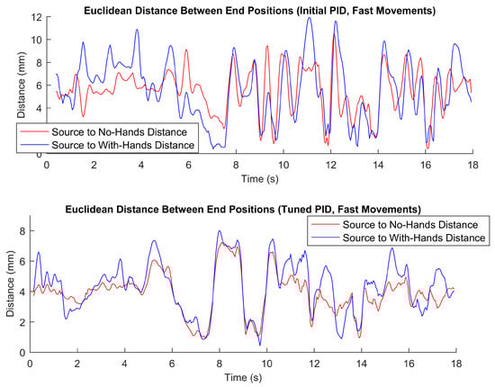 Figure 11. Distances between the source data (during recording) and the replayed data (both without and with hands in the hand controllers) in terms of the end position of the left hand controller during faster movements. The top graph is based on playback using the initial PID parameters (without our tuning), whereas the bottom graph is based on playback using tuned PID parameters.