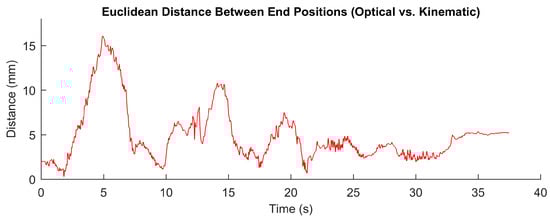 Figure 12. Distance between left hand controller positions measured using (1) a camera and an optically tracked marker (an AprilTag) and (2) using joint feedback and a kinematic model of the hand controller.