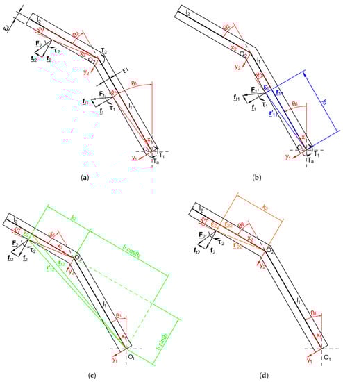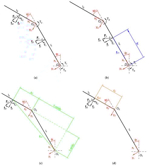 Model of the underactuated 2-phalanx thumb considering non-negligible phalanx thickness , (a) and determination of the components of vectors (b), (c), and (d).