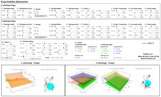 The software toolbox provides a useful tool to simplify the grasp-state space analysis and parametric optimization. It was developed under the Wolfram Mathematica environment [14]. The graphical user interface (GUI) is shown in Figure 7. It consists of four main areas. The first row (2-phalanx finger) and the second row (3-phalanx finger) refer to the finger geometric parameters explained in the previous sections; the third row collects the parameters relative to the target object (position, size, shape), other parameters used to define the limits of the grasp-state space, and the constraints on the normal and tangential contact forces both for two- and three-phalanx fingers; the fourth row includes the graphs that represents the grasp-state space and the scheme of the two-phalanx finger on the left side, whereas two graphs representing the grasp-state spaces and and the scheme of the three-phalanx finger are shown on the right side. Each subsection of the GUI is explained in more detail in the remainder of the paper.