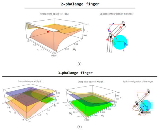 - in the case of the three-phalanx finger (Figure 8b) the first grasp-state space, which is a function of the parameters, shows a stable grasp—green surface—just in the of the defined space, mainly due to the trend of surface; on the other hand, the second grasp-state space, which is a function of the parameters, shows a stable grasp in the of the defined space.
