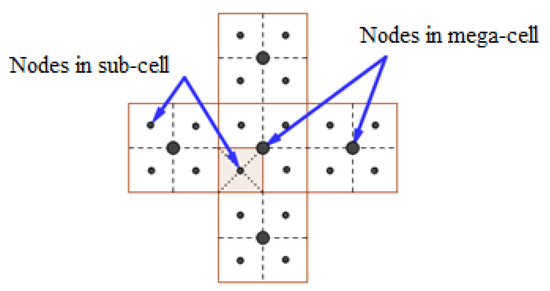 Each mega-cell will be characterised by a node located centrally in the cell, the same configuration will apply to each sub-cell. Figure 6 shows the location of the nodes in the centre of the cells. These nodes play an important role in creating the spanning tree of the SmSTC algorithm.
