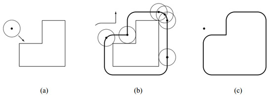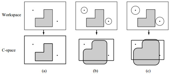 Considering a circular robot represented by a centre in space. Knowing the r radius of the robot can completely identify the set of points in the space occupied by the robot. . Suppose the workspace of robot has only one obstruction (see Figure 7). Figure 7b showing the robot moves around an obstacle to determine the shape of an obstacle in the C-Space. At that time, the robot can be viewed as a point in C-Space and it can move arbitrarily without affecting obstacles (Figure 7c). Depending on the size of each robot that the shape of the C-Space is different (see Figure 7).