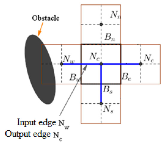 Where the edge between two adjacent mega-cells is completely free, a connected edge between the corresponding nodes on the graph can be created and vice versa, then two nodes cannot be connected through this edge. Figure 8 shows the connections of adjacent mega-cells. Node can create the connect with nodes , and because the common edges between them (, and ) are free. With node , it is not possible to create a connection to since the common edge is partially occupied by the obstacle. Figure 9 models this condition.
