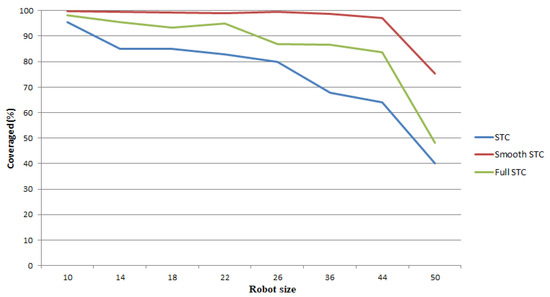 In simulation testing, our SmSTC algorithm used the same conditions and mapping in cell numbering nodes; the number of nodes used in testing is in the range 90–350. In testing we can adjust the number of nodes traversed by the robot along with the number and nature of the rules (in the knowledge-base) considered by our proposes system for both static and dynamic obstacles. For consistency, all experimental runs use the same size of robot, the same starting position, and the same starting time. Note: the coverage ratio and the relationship to time for the Smooth-STC on-line algorithm is greater than our SmSTC on-line and Full-STC algorithms as shown in Figure 13.