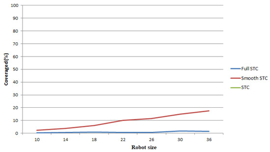 The influence of the robot size on the coverage ratio has been evaluated by gradually increasing the robot size. The results in Figure 14 show that the coverage ratio depends on the robot size, the larger the robot size the lower the ratio. This indicates that the SmSTC algorithm achieved coverage ratio close to 100% in most cases and this result is an improvement over the alternative algorithms considered; this is especially evident when the robot size is bigger. In the same map with the same complexity (when changing the size of the robot) the testing obtained the overlap area ratio of those algorithms as shown in Figure 15. The ratio of overlap area of SmSTC algorithm remains much larger than previous algorithms, the larger the robot size, the larger the repeating area. However, these overlap areas are mainly located around the obstructions. In fact, these areas have ‘stain’ density more than areas far away from obstacles. So repeating in these areas is also meant to be cleaner.