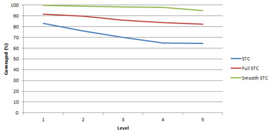 The coverage ratio depend on time of Smooth-STC, FullSTC and SmSTC.